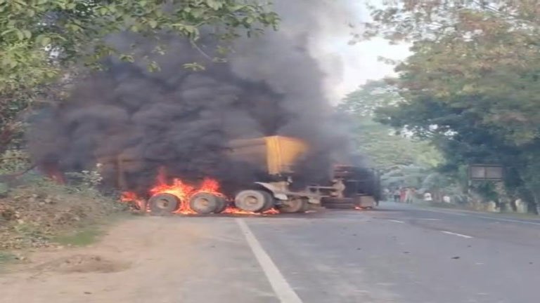 भागलपुर में ट्रक-मिनी ट्रक भिड़ंत, लगी भीषण आग