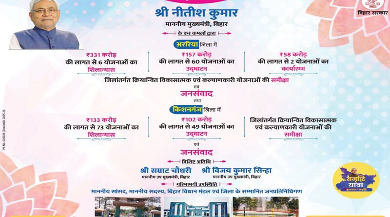 अररिया और किशनगंज में समृद्धि यात्रा के दौरान मुख्यमंत्री करोड़ों की विकास योजनाओं का करेंगे शिलान्यास व उद्घाटन